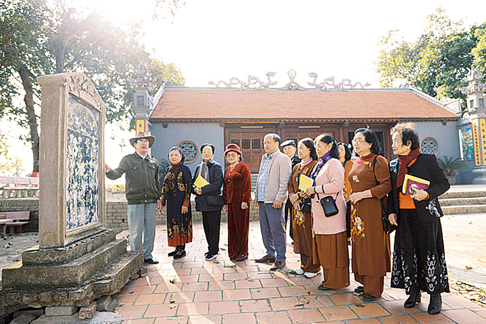 Ông Nguyễn Bá Thảo, Trưởng thôn Đoài, Trưởng Ban Quản lý di tích cấp quốc gia Đền thờ Đức thánh Tam Giang (Đền Xà) giới thiệu với du khách về di tích.