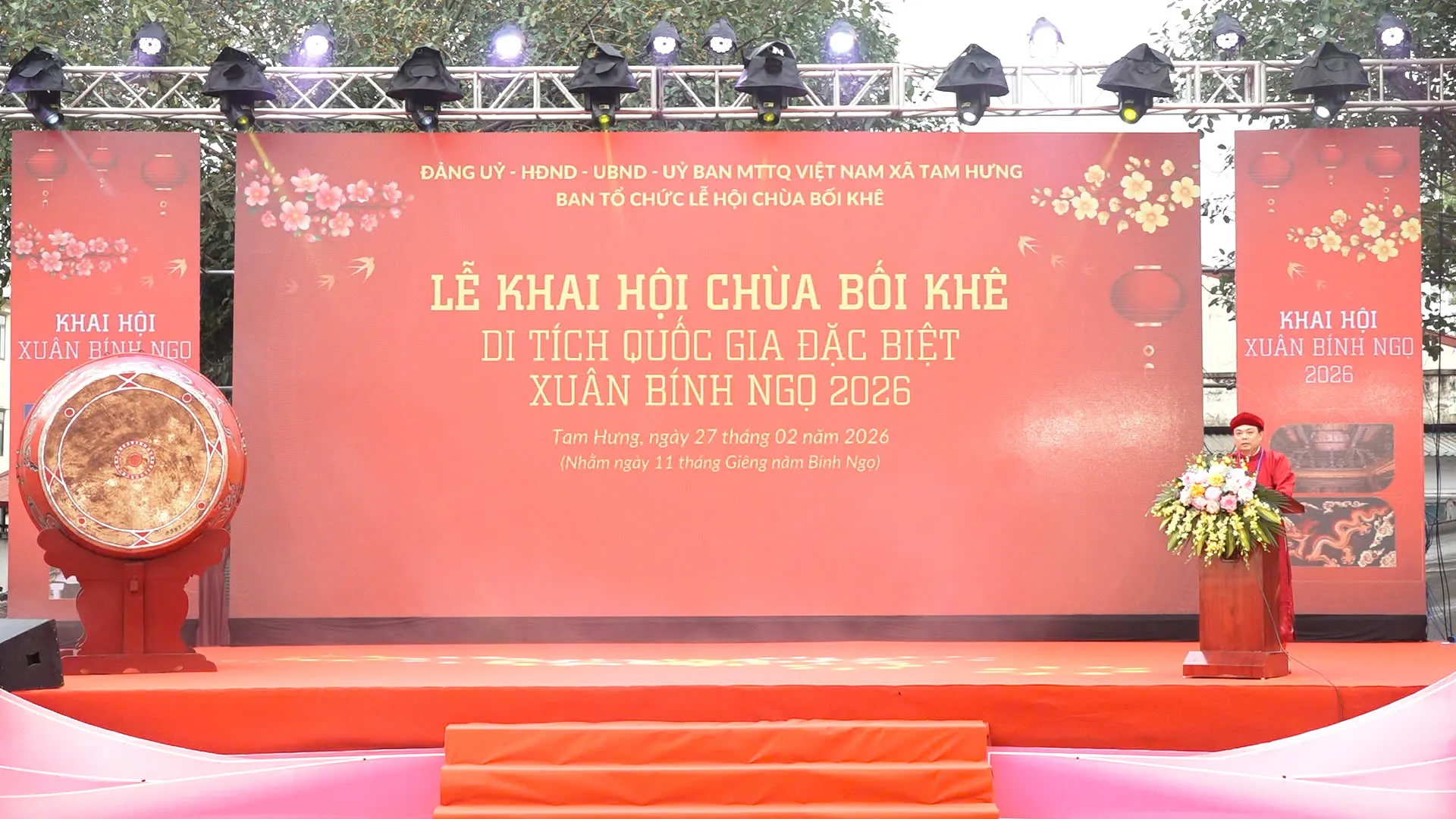 Sau Lễ khai mạc, Bí thư Đảng ủy xã Tam Hưng Bùi Văn Sáng đánh trống chính thức khai hội Lễ hội chùa Bối Khê Xuân Bính Ngọ 2026.