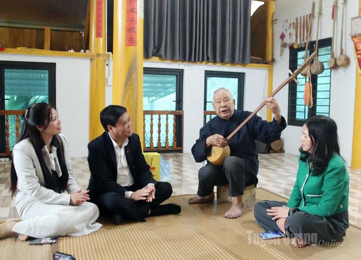 Đồng chí Mai Đức Thông, Tổng Biên tập Báo và phát thanh, truyền hình Tuyên Quang, Chủ tịch Hội Nhà báo tỉnh và cán bộ xã thưởng thức làn điệu Then, tiếng đàn Tính từ Nghệ nhân Nhân dân Hà Văn Thuấn.
