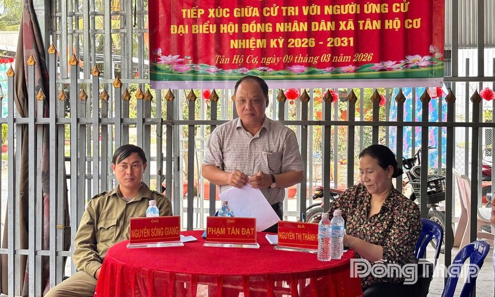 Đồng chí Phạm Tấn Đạt, Bí thư Đảng ủy, Chủ tịch Hội đồng nhân dân xã, Chủ tịch Ủy ban Bầu cử xã Tân Hộ Cơ (người đứng) tham gia đầy đủ các hội nghị tiếp xúc cử tri với vai trò là ứng cử viên Đại biểu HĐND xã nhiệm kỳ 2026 - 2031.