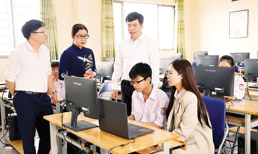 Đồng chí Nguyễn Viết Toàn, Bí thư Đảng ủy, Chủ tịch HĐND xã thăm, động viên giáo viên, học sinh Trường Trung học cơ sở Tân Yên.