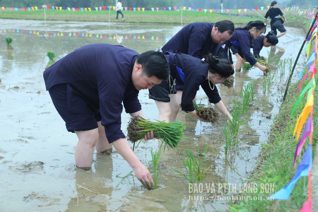 Các đại biểu tham gia nghi thức xuống đồng cấy lúa, cầu cho mùa màng bội thu
