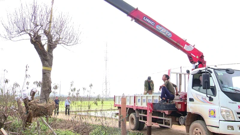 Nhiền hộ gia đình khác trên địa bàn xã Thọ Phú đang thuê nhân công, máy móc vận chuyển cây đến địa điểm tổ chức hội chợ.