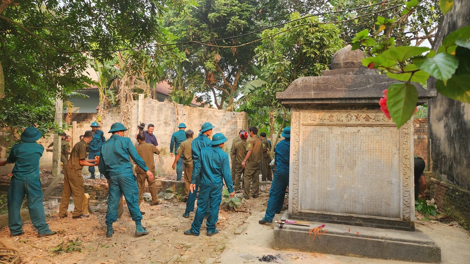 Lực lượng chức năng xã Thọ Phú tháo dỡ công trình xuống cấp, phát quang cây cối tại khu vực bia cổ.