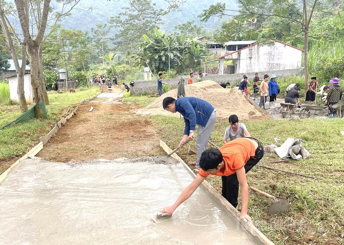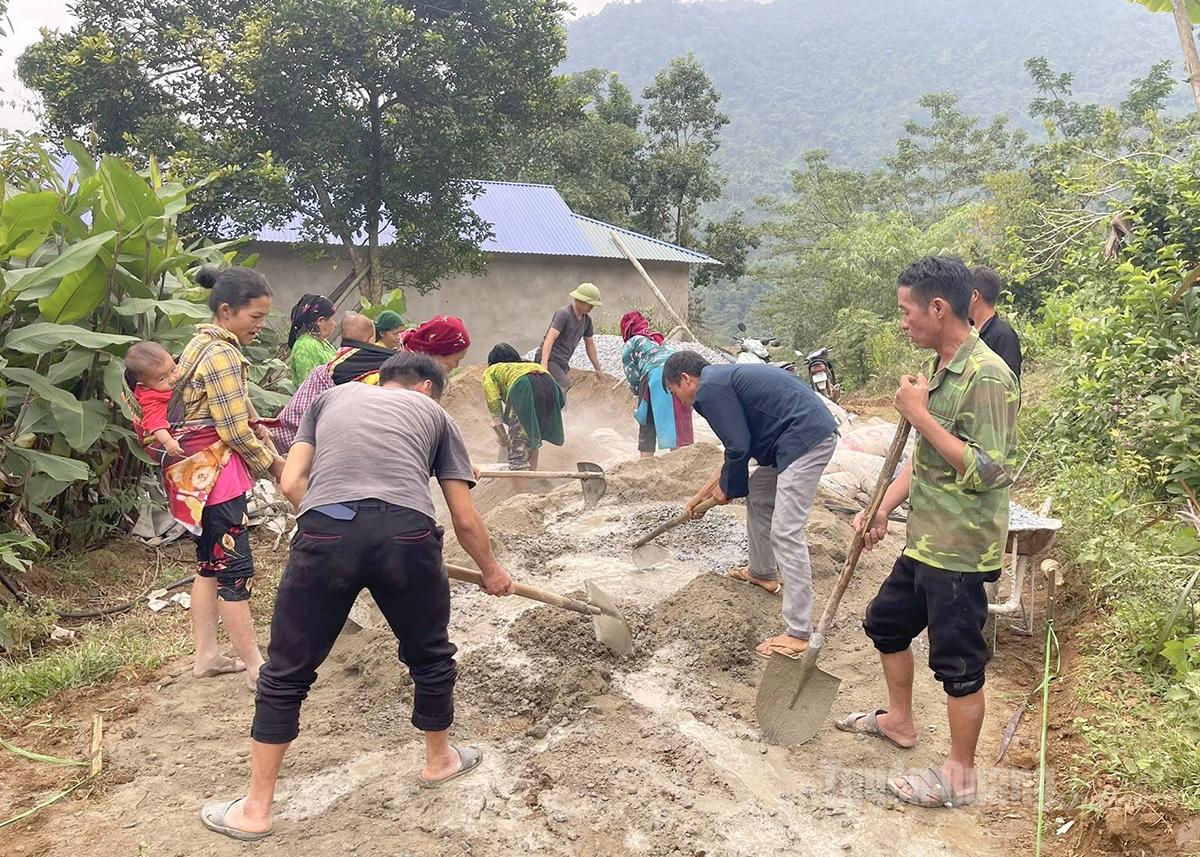 Nhân dân thôn Pồng Trằm chung sức làm đường giao thông.
