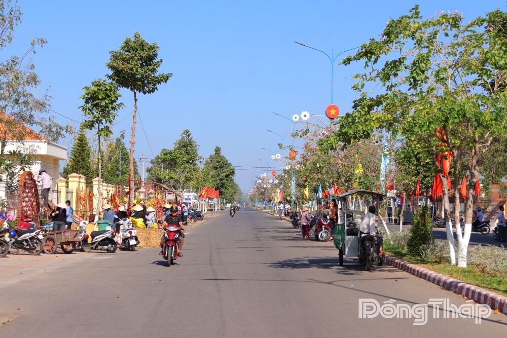 Không gian xuân rộn ràng trên tuyến đường Nguyễn Tất Thành với các cụm tiểu cảnh mừng Đảng – mừng Xuân Bính Ngọ 2026 do các ấp và trường học trên địa bàn xã Thường Phước thực hiện.