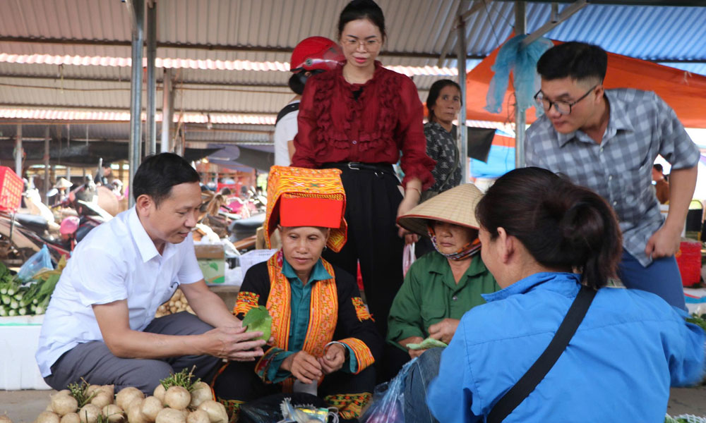 Nét độc đáo ở phiên chợ là người mua hàng được cán bộ xã hướng dẫn sử dụng điện thoại thông minh để thanh toán trực tuyến thay cho tiền mặt.