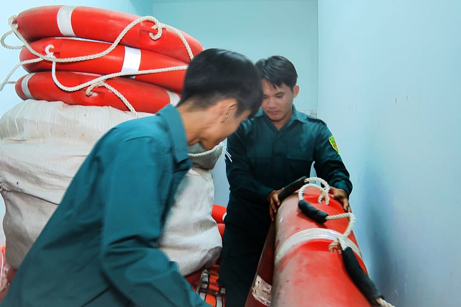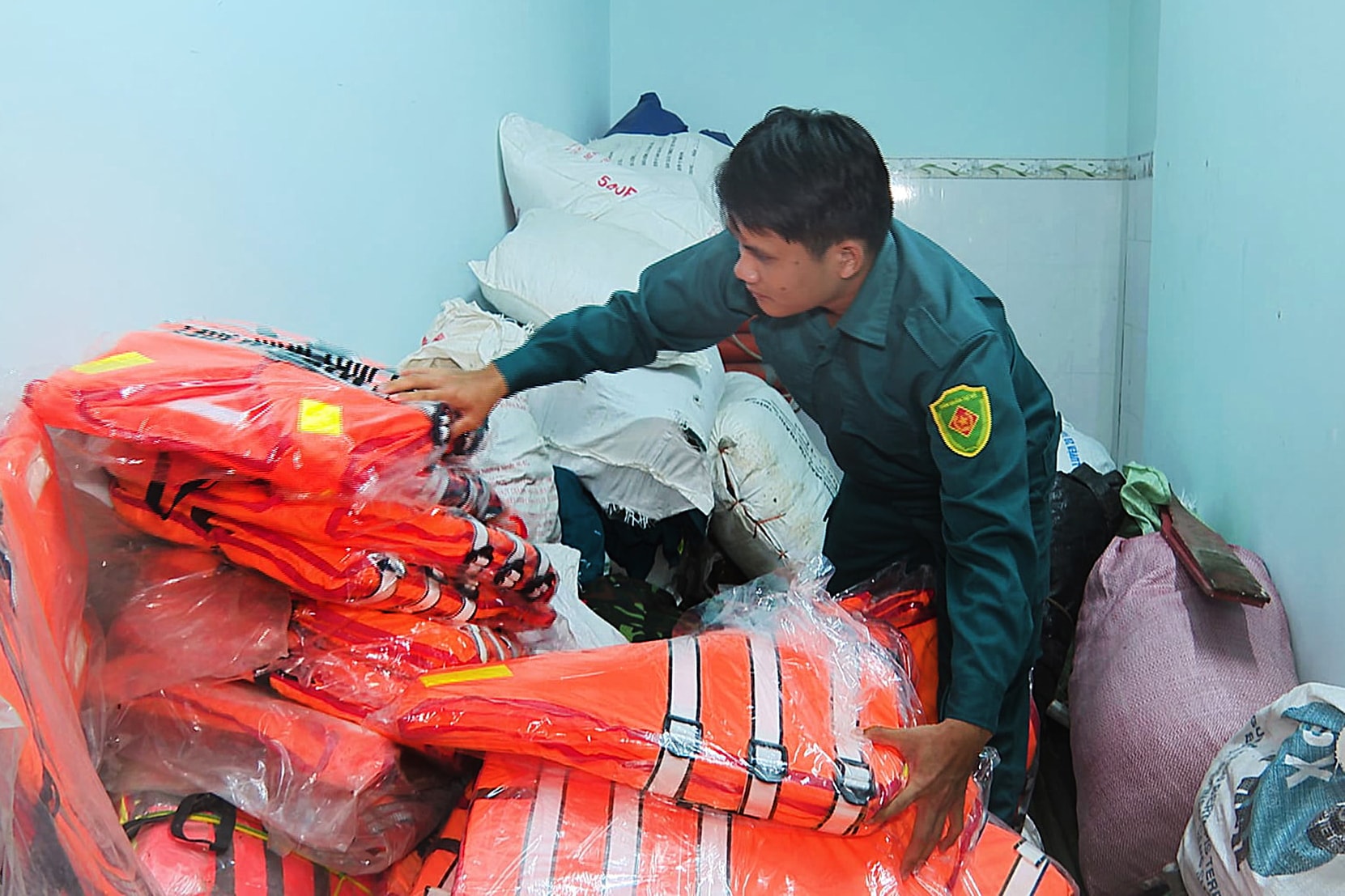 Dân quân tự vệ xã Tuyên Quang chuẩn bị áo phao cứu hộ ứng phó với bão