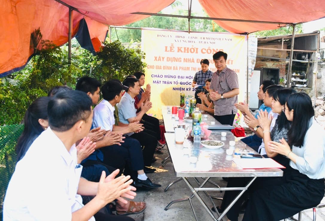 Lãnh đạo xã Ứng Hòa dự lễ khởi công xây dựng Nhà đại đoàn kết cho gia đình bà Phạm Thị Hiên (thôn Mãn Xoan). Ảnh: Như Thành