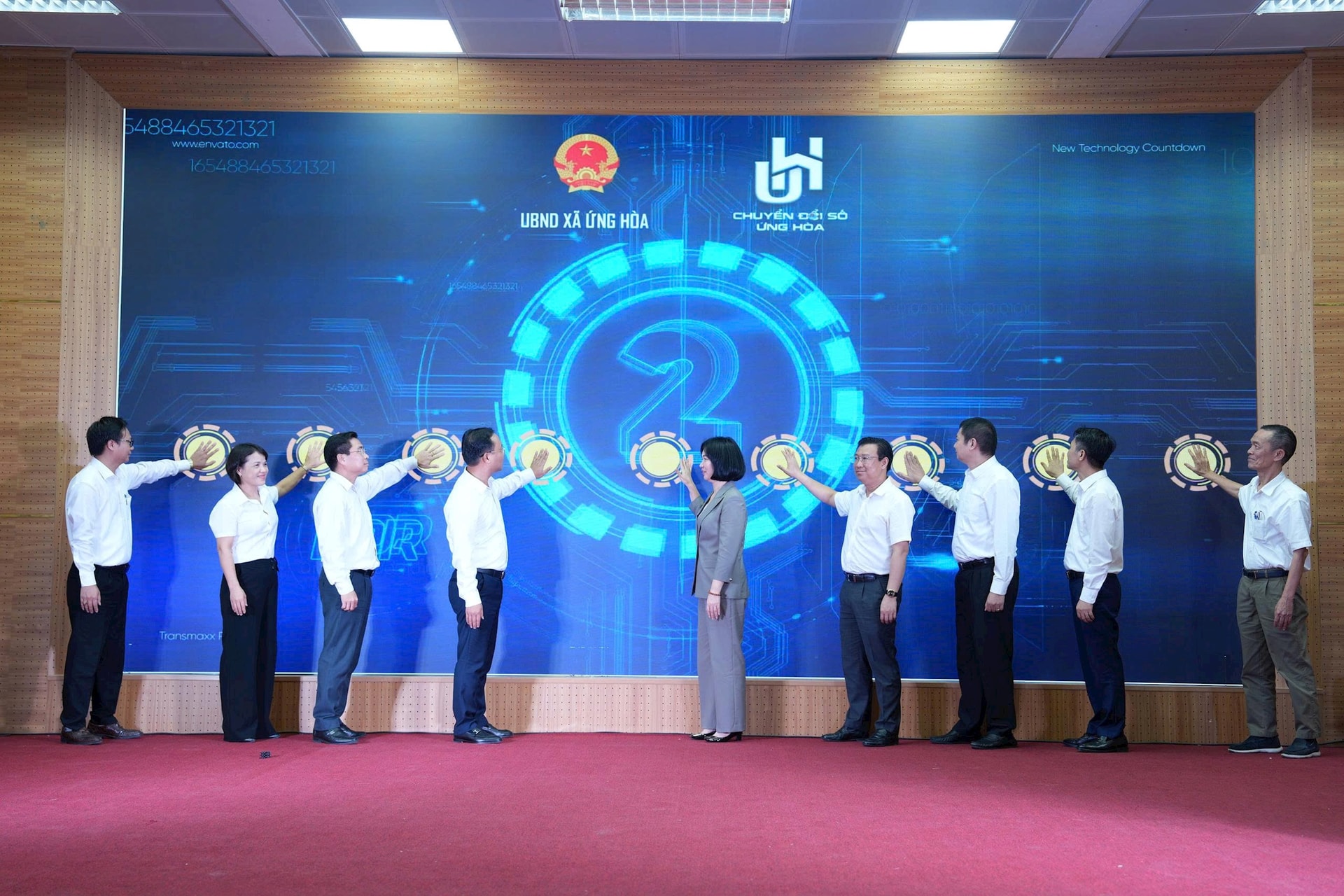Lãnh đạo thành phố và xã Ứng Hòa bấm nút ra mắt bản sao số xã Ứng Hòa. Ảnh: Bạch Thanh