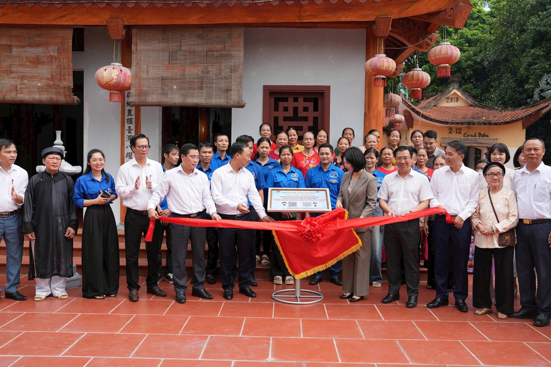 Lãnh đạo thành phố và xã Ứng Hòa gắn biển công trình tu bổ, tôn tạo di tích đền Trung Thượng. Ảnh: Bạch Thanh