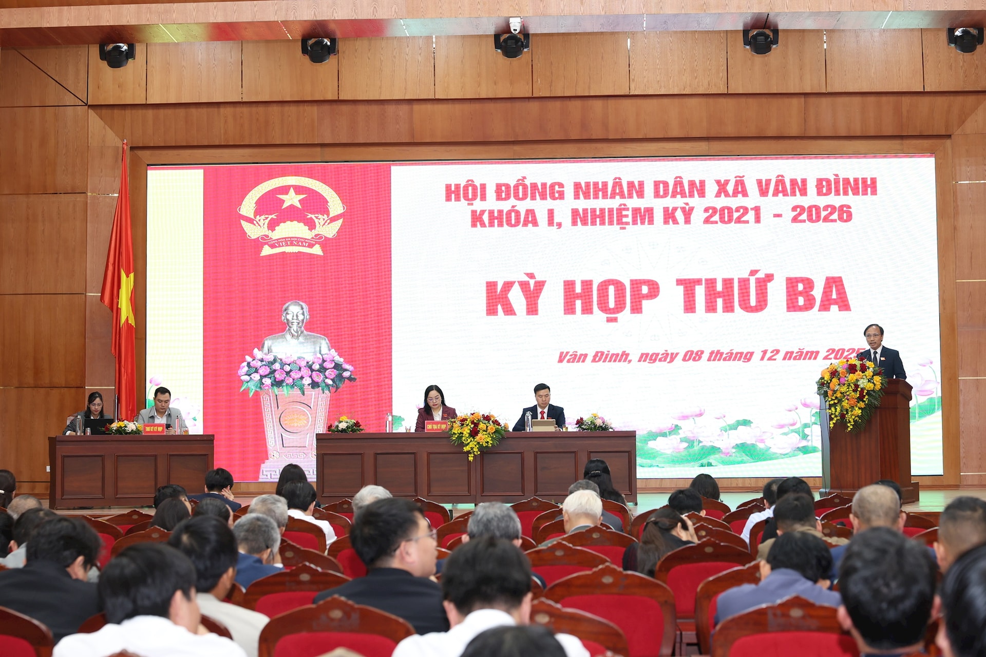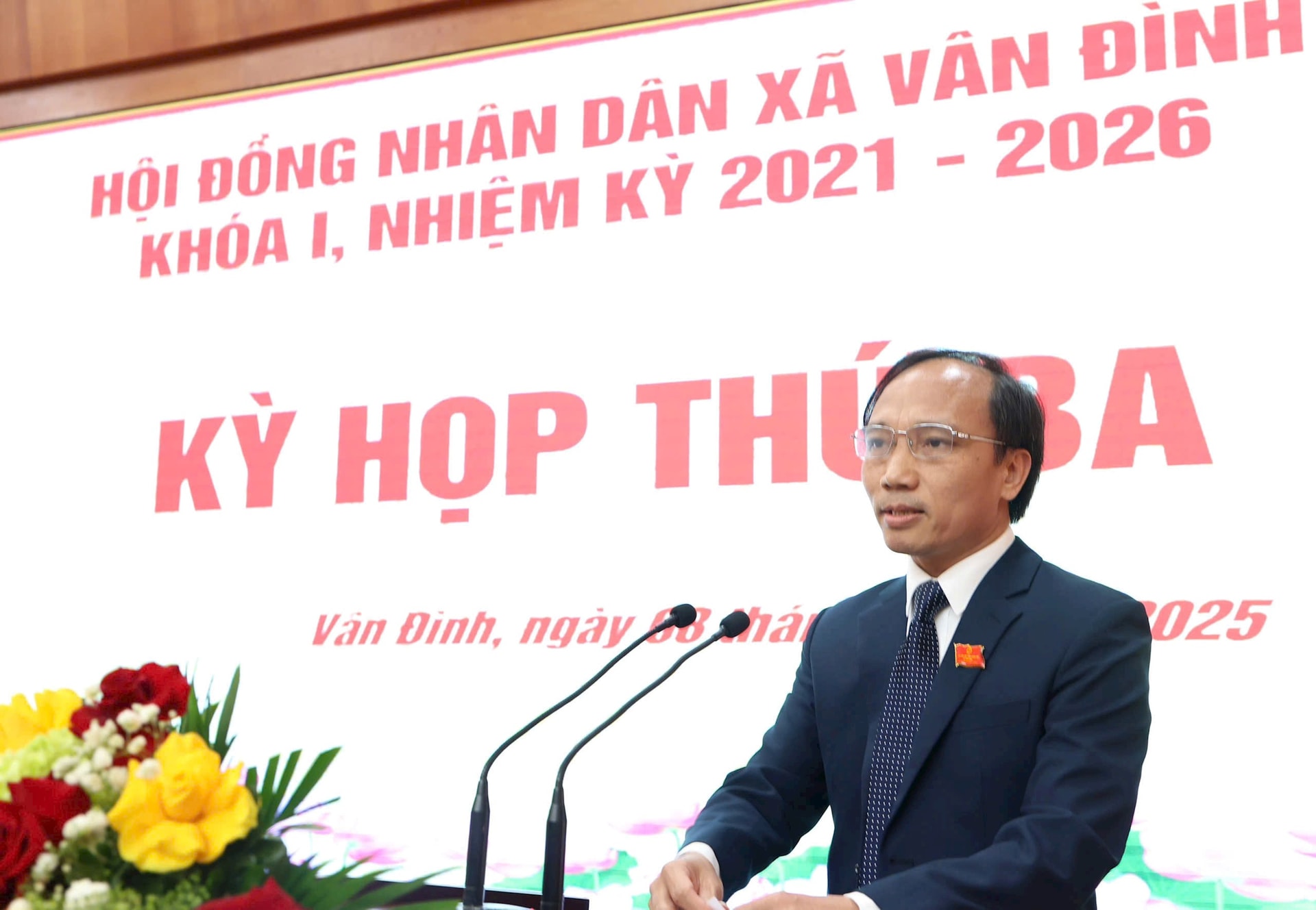 Chủ tịch UBND xã Vân Đình Nguyễn Ngọc Điệp phát biểu tại kỳ họp. Ảnh: Đình Thủy