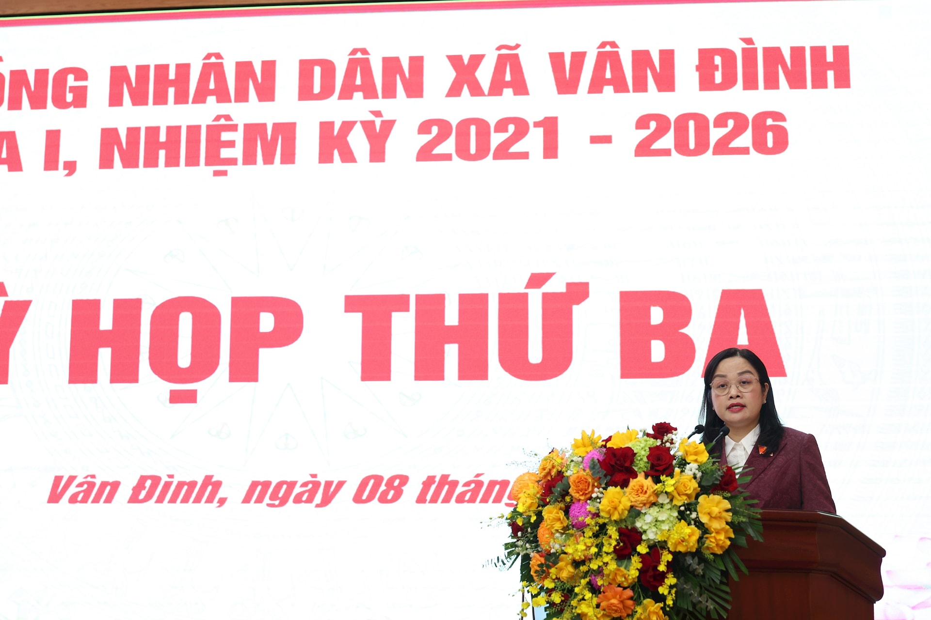 Bí thư Đảng ủy xã Vân Đình Bùi Thị Thu Hiền phát biểu tại kỳ họp. Ảnh: Đình Thủy