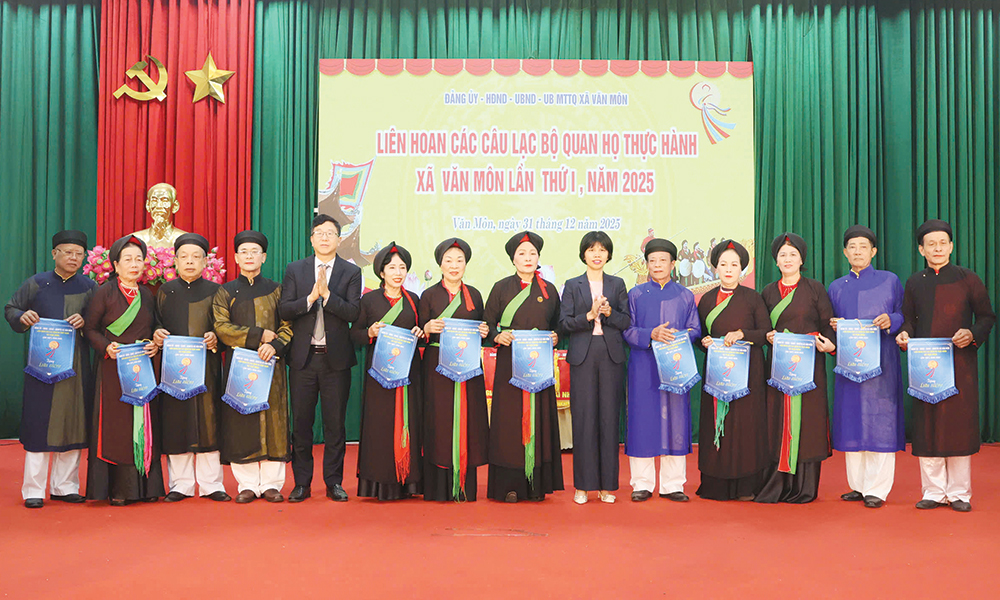 Các đồng chí lãnh đạo xã trao cờ lưu niệm Liên hoan các câu lạc bộ quan họ thực hành xã Văn Môn lần thứ nhất năm 2025.