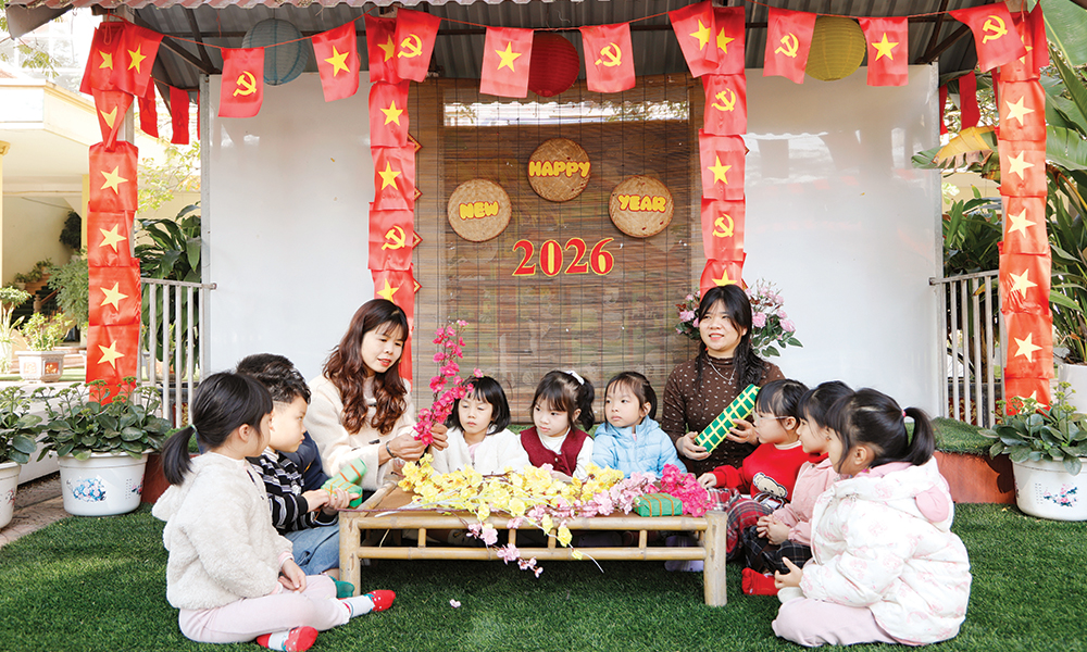 Giáo viên và học sinh Trường Mầm non Đông Thọ, xã Văn Môn trong giờ học thực hành.