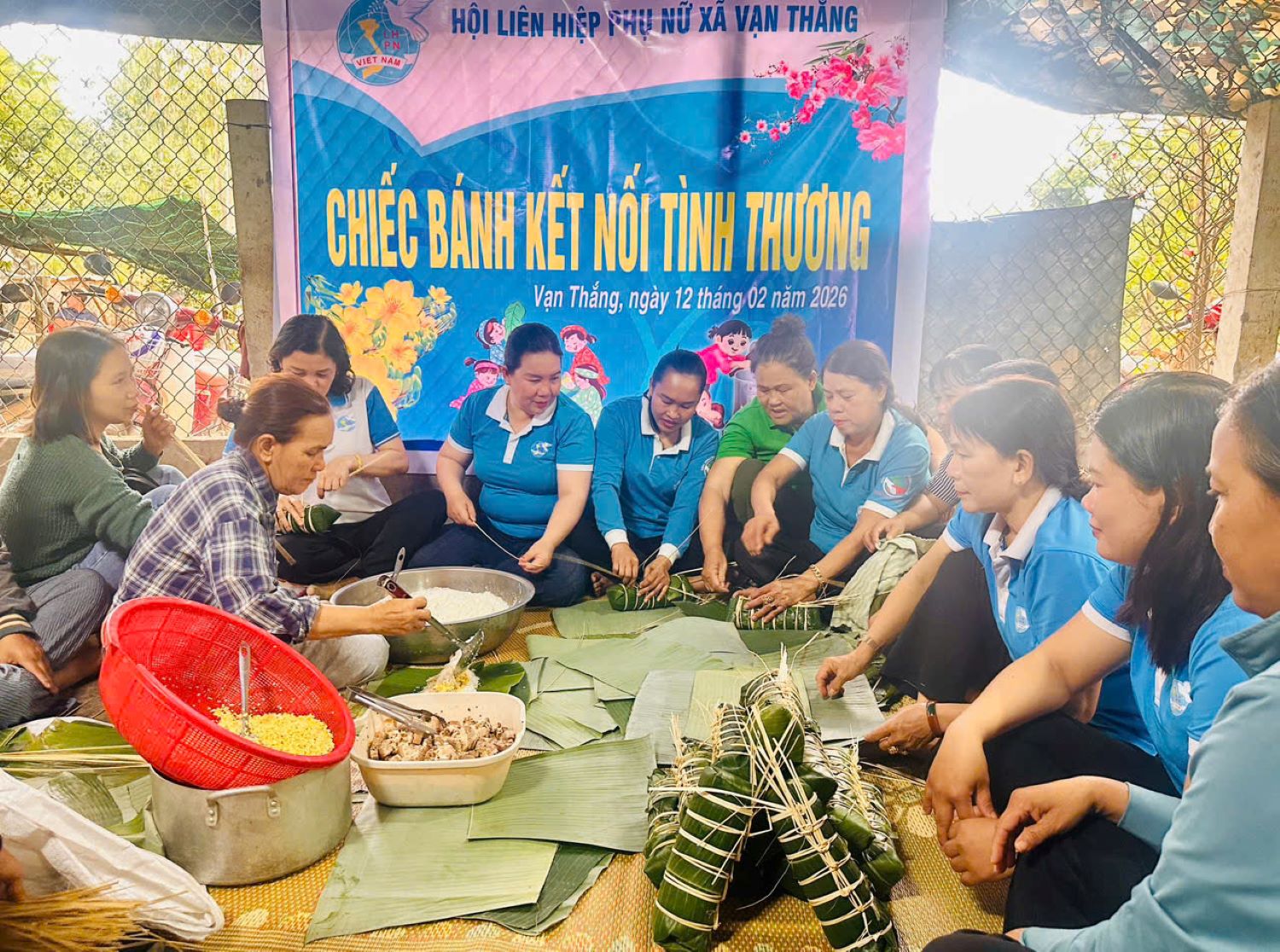 Nhân dịp Tết Nguyên đán Bính Ngọ 2026, ngày 12-2, Hội Liên hiệp Phụ nữ xã Vạn Thắng tổ chức hoạt động gói bánh tét tặng hội viên phụ nữ khó khăn và cán bộ, chiến sĩ các lực lượng trực Tết trên địa bàn xã.