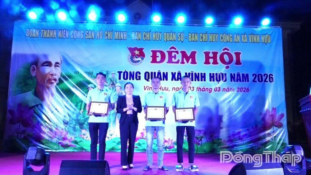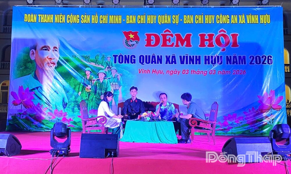 Chương trình Đêm hội tòng quân 2026 xã Vĩnh Hựu với chủ đề “Thanh niên Đồng Tháp – sẵn sàng lên đường bảo vệ Tổ quốc” diễn ra sôi nổi với nhiều tiết mục văn nghệ với sự tham gia của 6 đội với hơn 100 thanh niên là những cán bộ Đoàn, đoàn viên, thanh niên, quân nhân tiêu biểu trong công tác Đoàn và phong trào thanh niên xã Vĩnh Hựu.