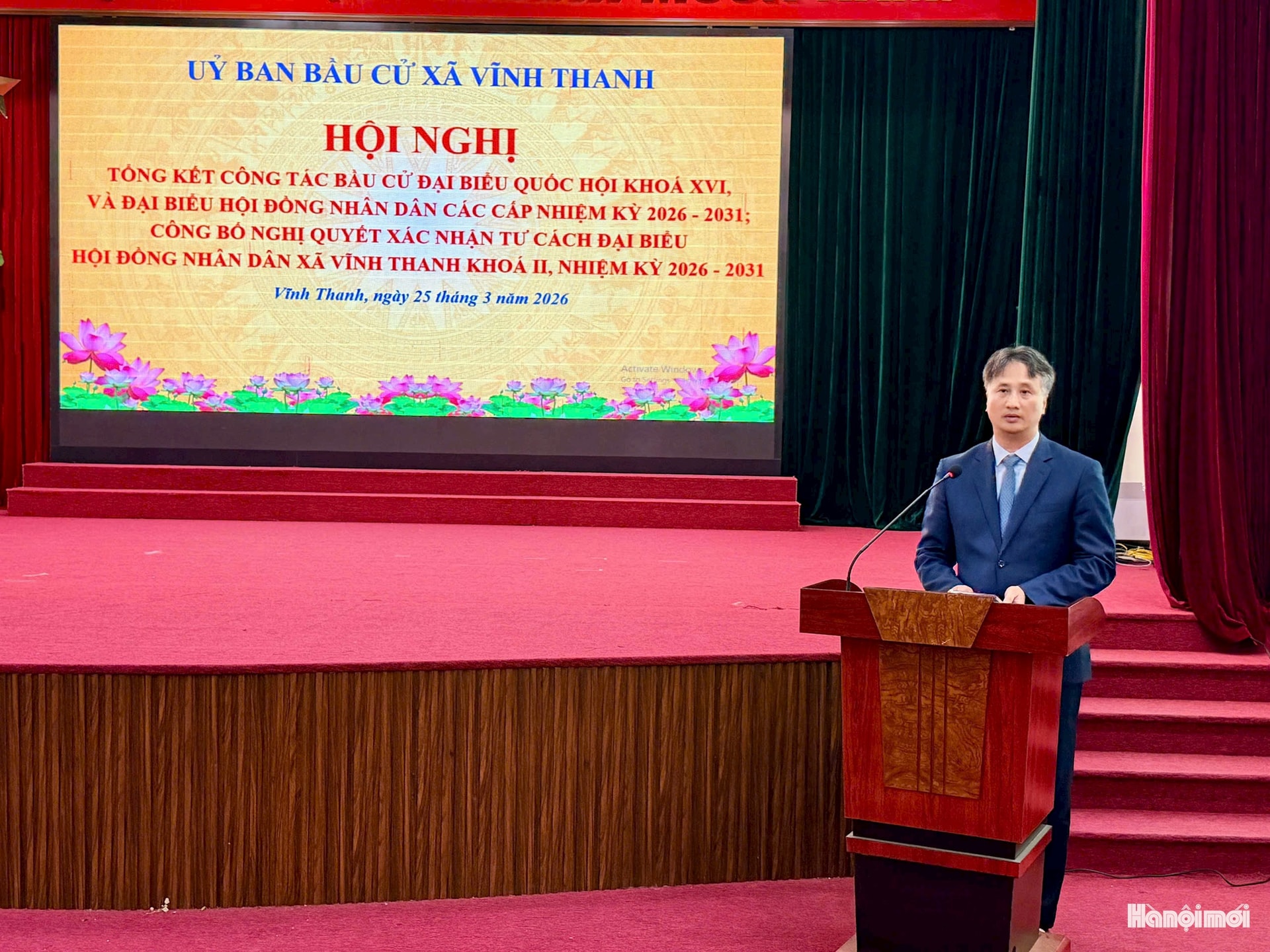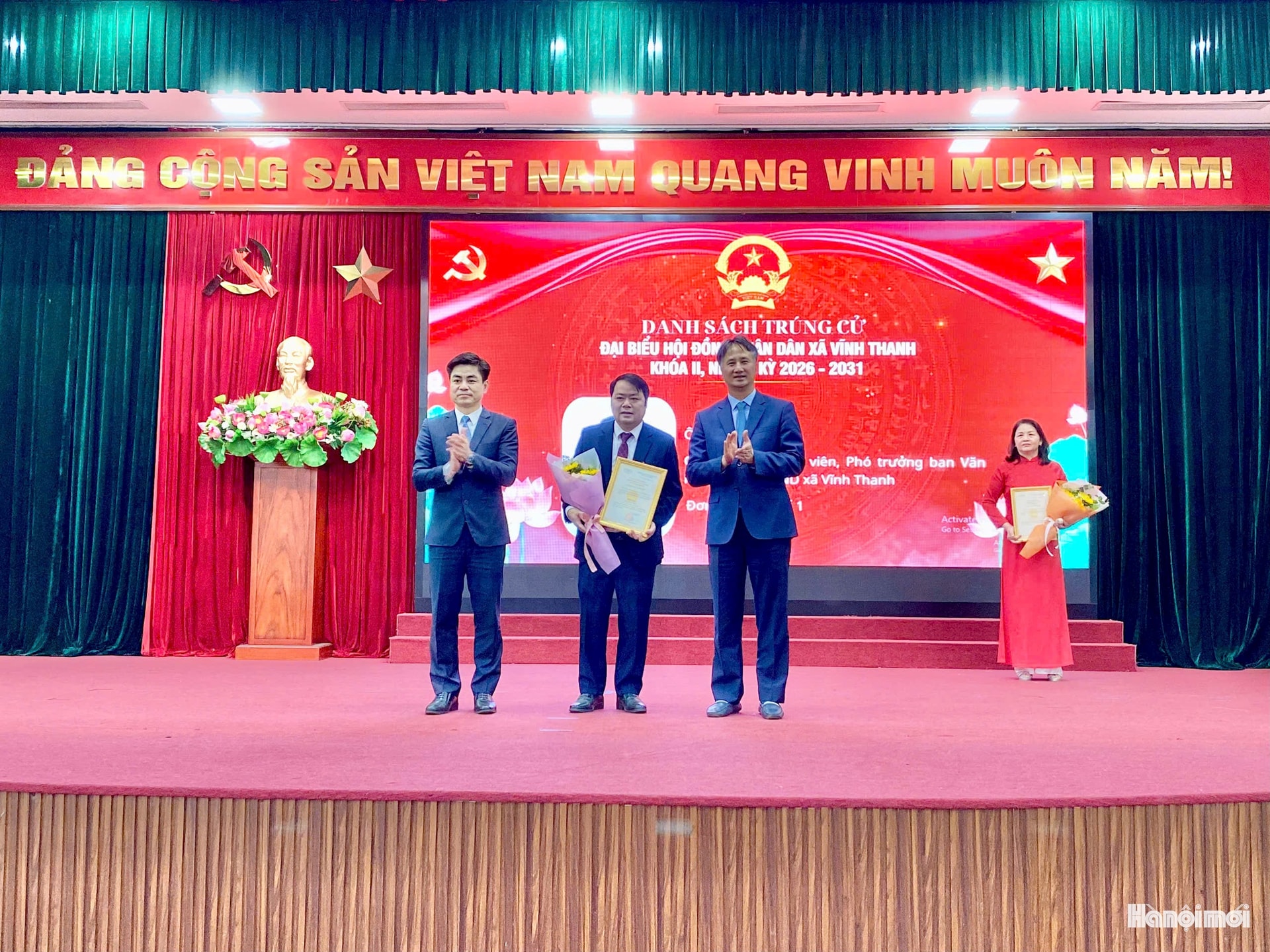 Trao quyết định, tặng hoa chúc mừng đại biểu trúng cử HĐND xã Vĩnh Thanh khóa II, nhiệm kỳ 2026-2031. Ảnh: TH