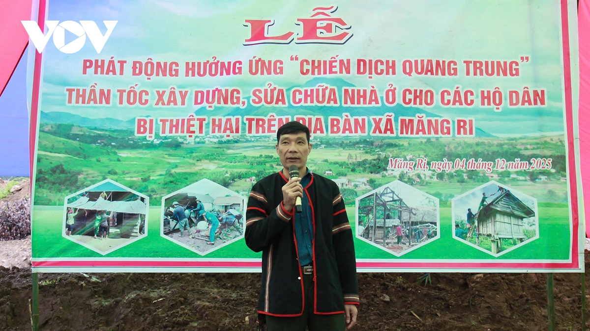 Sáng 4/12, tại thôn Chung Tam, UBND xã Măng Ri, tỉnh Quảng Ngãi tổ chức lễ phát động hưởng ứng “Chiến dịch Quang Trung - Thần tốc xây nhà mới, ổn định cuộc sống cho nhân dân xã Măng Ri”. Từ nay đến Tết Nguyên đán Bính Ngọ 2026, xã Măng Ri sẽ hoàn thành xây mới 80 căn nhà cho người dân.