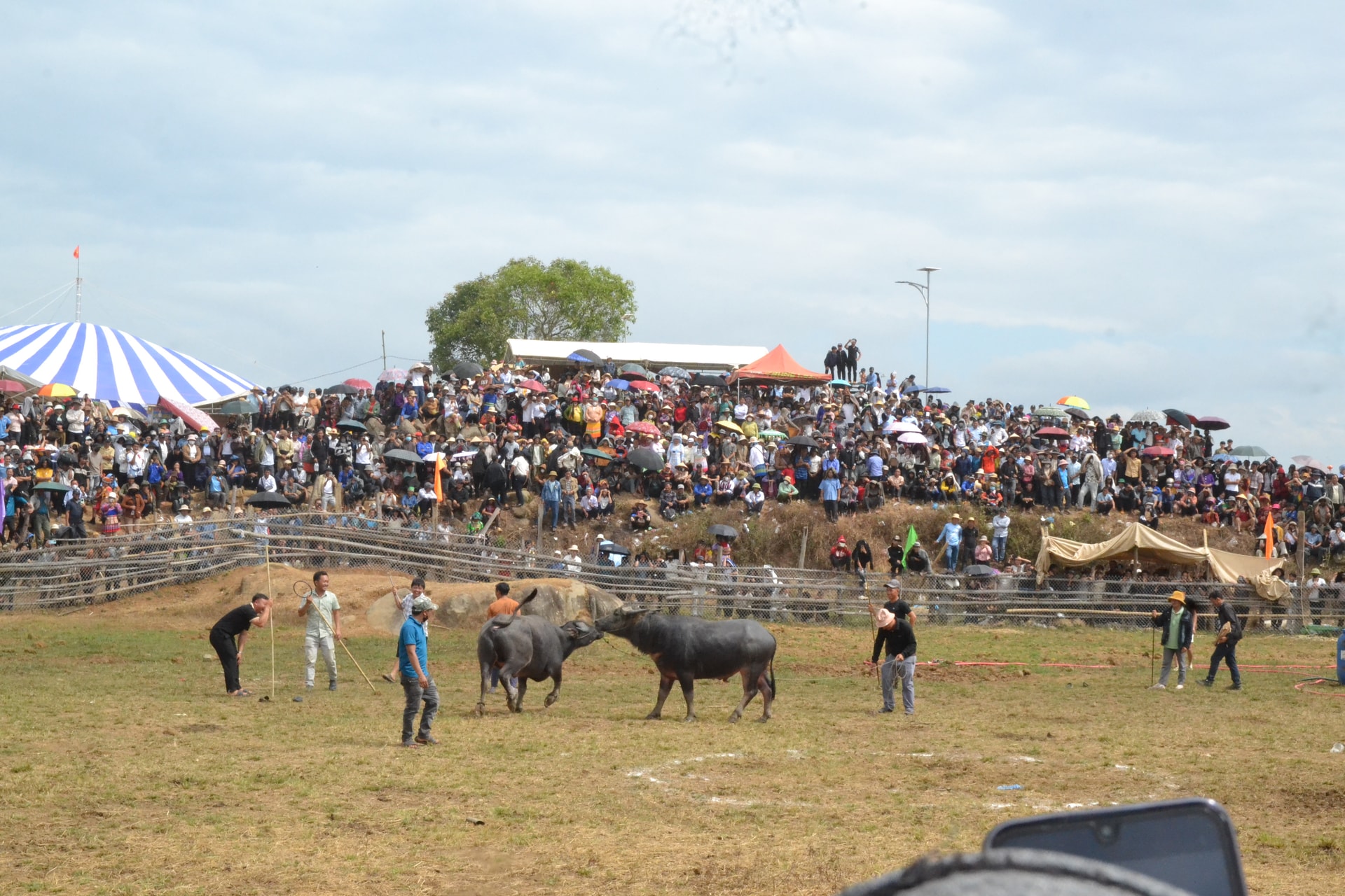 Chọi trâu tại Lễ hội Lồng Tồng xã Quảng Hòa thu hút đông đảo người dân tham gia cổ vũ