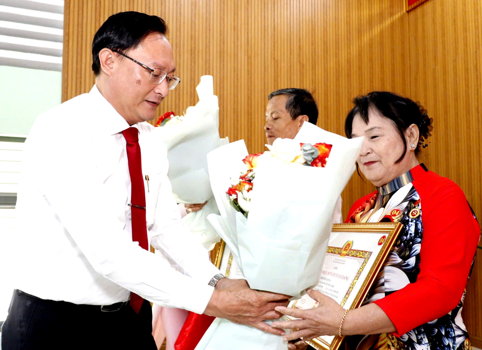 Đồng chí Trần Văn Tuấn, Ủy viên Ban Thường vụ Thành ủy, Phó Chủ tịch HĐND TPHCM, Trưởng Ban Nội chính Thành ủy TPHCM, trao Huy hiệu Đảng và hoa chúc mừng đảng viên cao tuổi Đảng. Ảnh: NGÔ BÌNH
