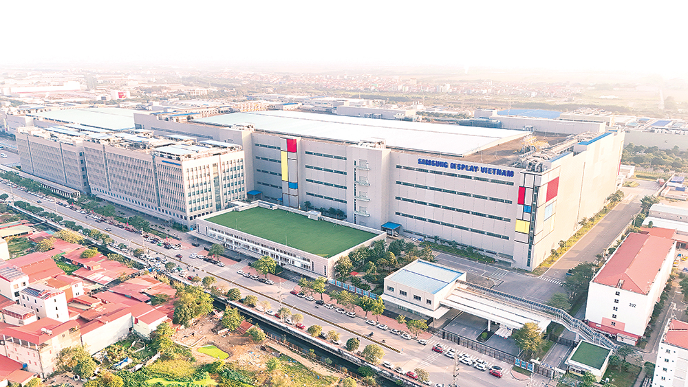 Công nhân làm việc trong dây chuyền sản xuất của Công ty trách nhiệm hữu hạn Samsung Electronics Việt Nam.