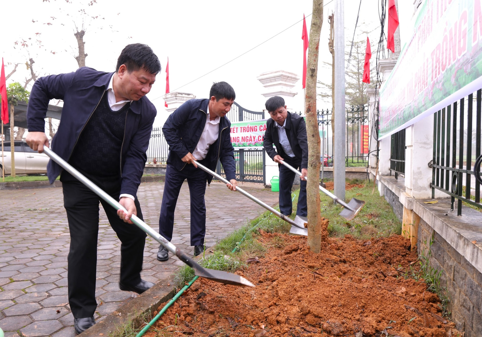 Bí thư Đảng ủy, Chủ tịch HĐND xã Yên Xuân Mạc Đình Minh; Phó Bí thư Thường trực Đặng Minh Tân; Phó Bí thư Đảng ủy, Chủ tịch UBND xã Phùng Khắc Sơn trồng cây đầu xuân. Ảnh: N.M