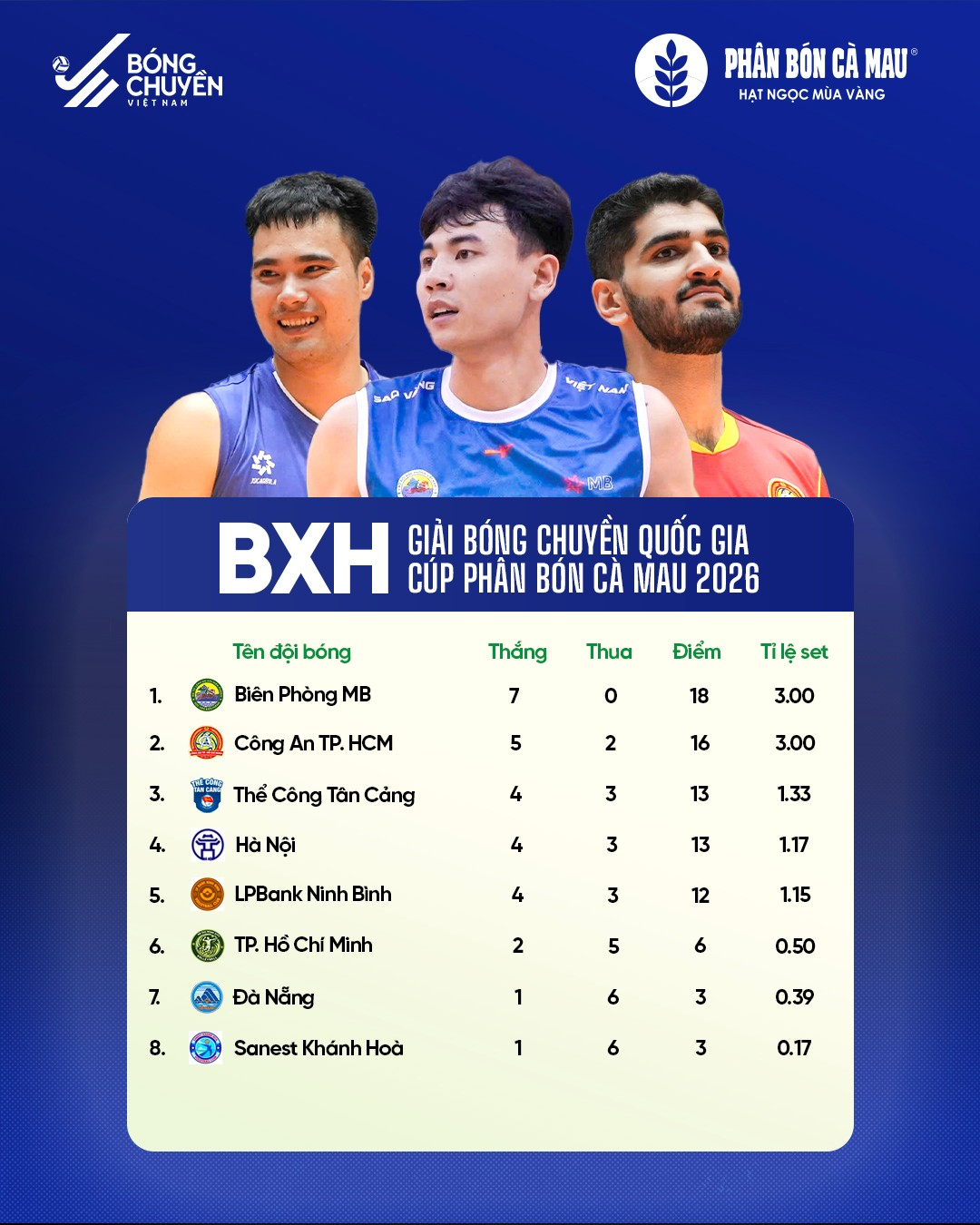 Trước đó, đương kim vô địch Biên phòng - MB tiếp tục gây ấn tượng khi ngược dòng thắng LPBank Ninh Bình 3-2, khép lại vòng 1 với thành tích 7 trận toàn thắng.