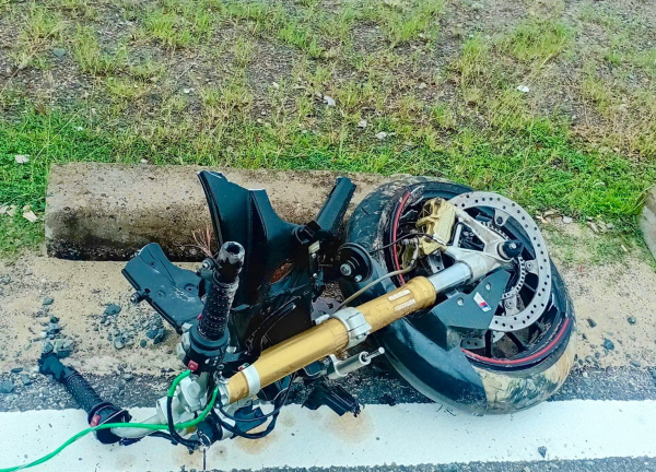 Phần đầu xe mô tô của "phượt thủ" bị tai nạn bị gãy rời khỏi thân.