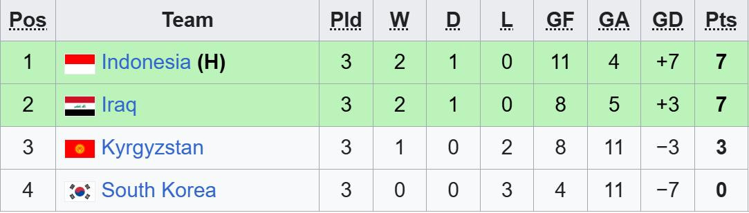 Với 7 điểm sau ba trận, Indonesia đứng đầu bảng A, nối dài chuỗi phong độ ấn tượng sau chiến thắng hủy diệt Thái Lan 6-1 và chức vô địch SEA Games 33 lịch sử.