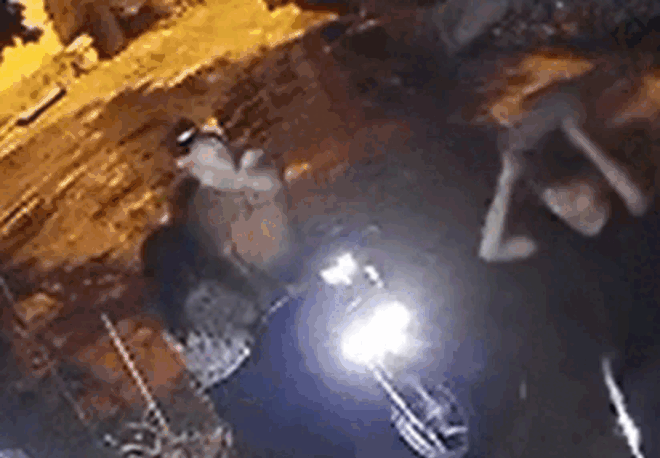 Camera an ninh ghi lại cảnh người chủ quán trên đi xe máy, cùng 3 thanh niên khác đứng trước nhà người đăng clip và có những lời đe dọa. Ảnh cắt từ clip. (Nguồn: Bùi Hữu Tịnh)