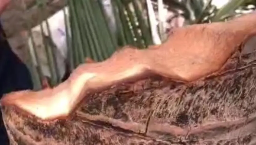 Vết cắt ở phần thân dừa gãy dưới đất cũng giống hình dáng của tôn. Ảnh chụp màn hình