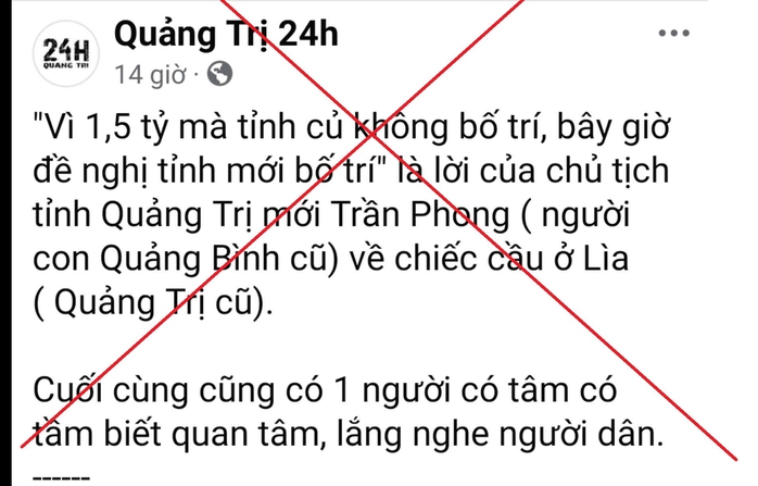 Tuy nhiên, theo cơ quan chức năng, một số tài khoản đã cắt ghép, trích dẫn không đầy đủ, làm sai lệch ngữ cảnh phát ngôn của Chủ tịch UBND tỉnh Quảng Trị, gắn với các nội dung như: "Vì 1,5 tỉ mà tỉnh cũ không bố trí, bây giờ đề nghị tỉnh mới bố trí" hay "Những tồn đọng ở Quảng Trị cũ - giờ phải để Quảng Trị mới giải quyết".