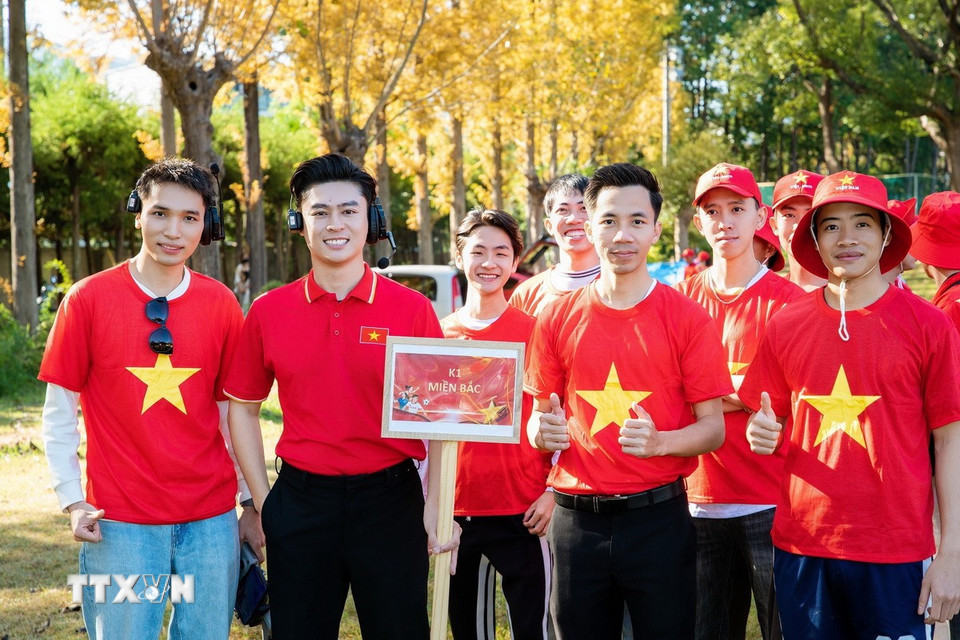 Khối đại diện cho "Miền Bắc" trong cộng đồng tham gia xếp hình lá cờ Việt Nam. (Ảnh: Xuân Giao/TTXVN)