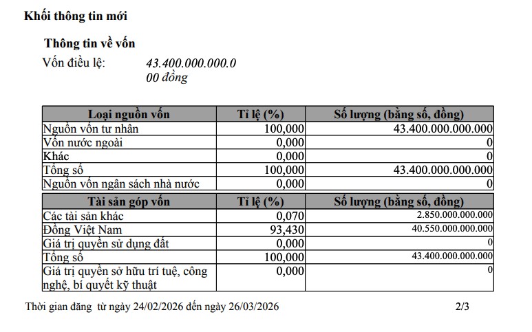 Đây là lần tăng vốn thứ ba của doanh nghiệp này kể từ đầu năm 2026. Trước đó, vào ngày 8/1/2026, doanh nghiệp đã tăng vốn từ 25.000 tỷ đồng lên 35.500 tỷ đồng (tăng thêm 10.500 tỷ đồng).