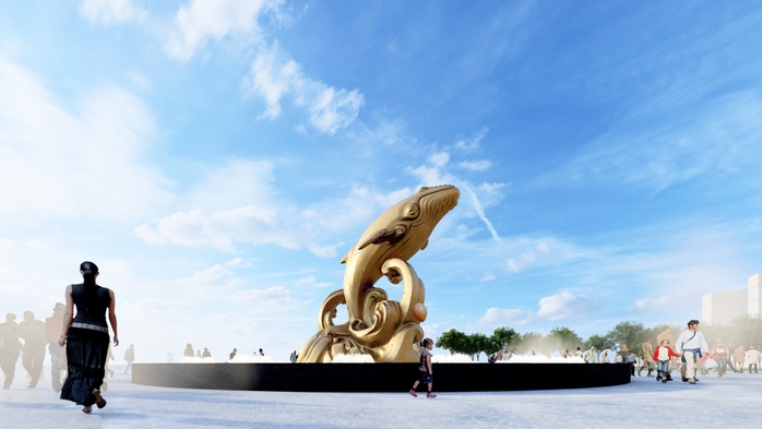 Biểu tượng cá Ông được đặt tại khu vực cột cờ hiện hữu, cao khoảng 8 m, đúc bằng đồng đỏ dày 20 mm, liên kết với bộ khung inox, thời gian sử dụng theo thiết kế của công trình lên tới 100 năm.