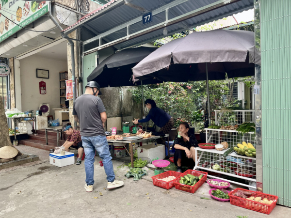 Hàng rau vẫn bày bán trên vỉa hè ngõ 481/1 Ngọc Lâm.