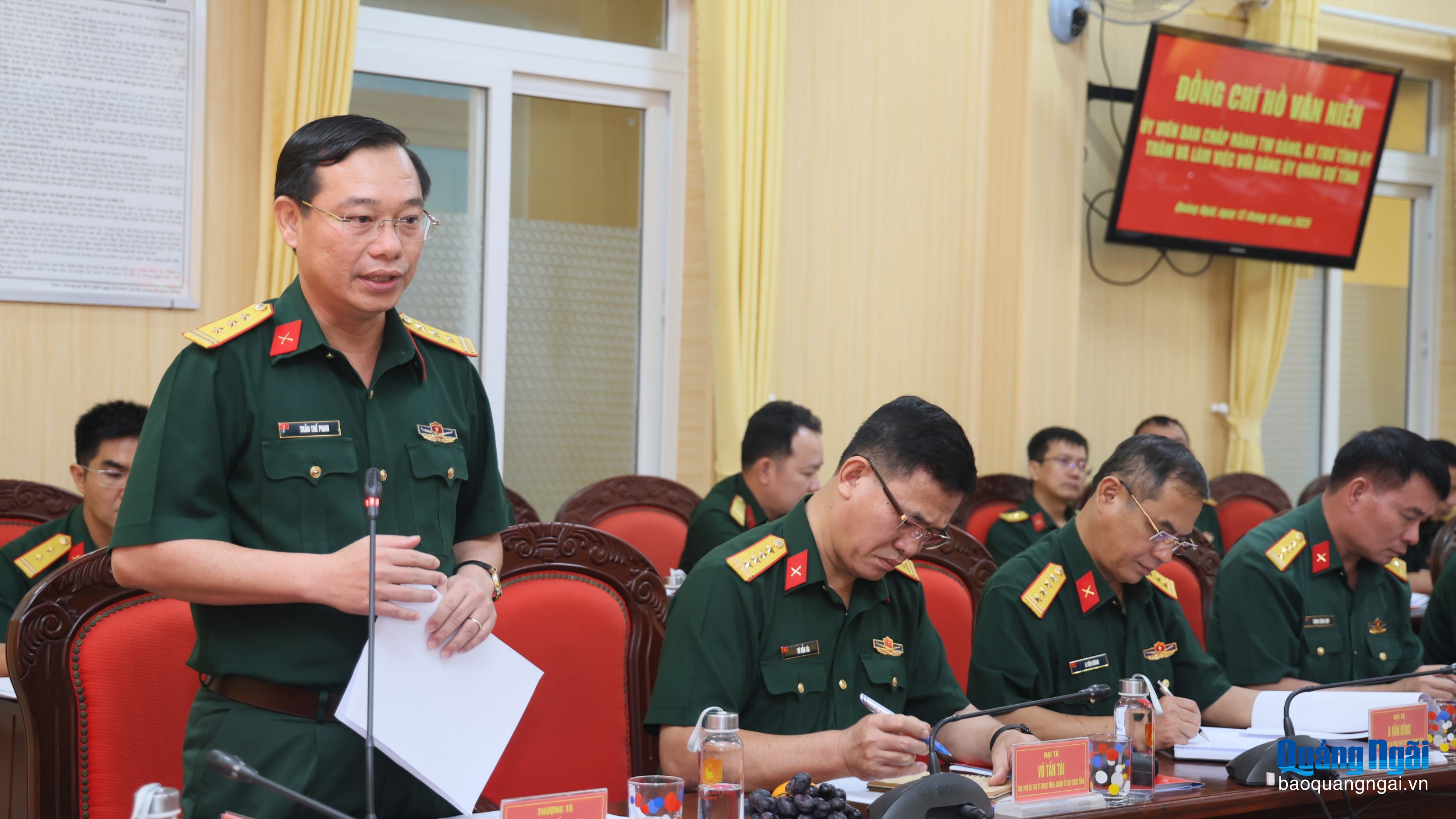 Thượng tá Trần Thế Phan - Chỉ huy trưởng Bộ CHQS tỉnh báo cáo tại buổi làm việc.