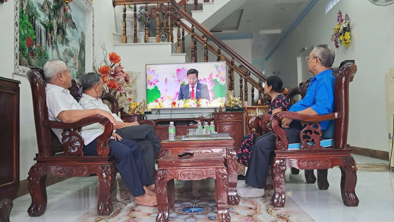 Ông Hoàng Hữu Thuyết, phường Hàm Thắng, tỉnh Lâm Đồng (áo xanh) cùng người thân, hàng xóm theo dõi phiên Đại hội