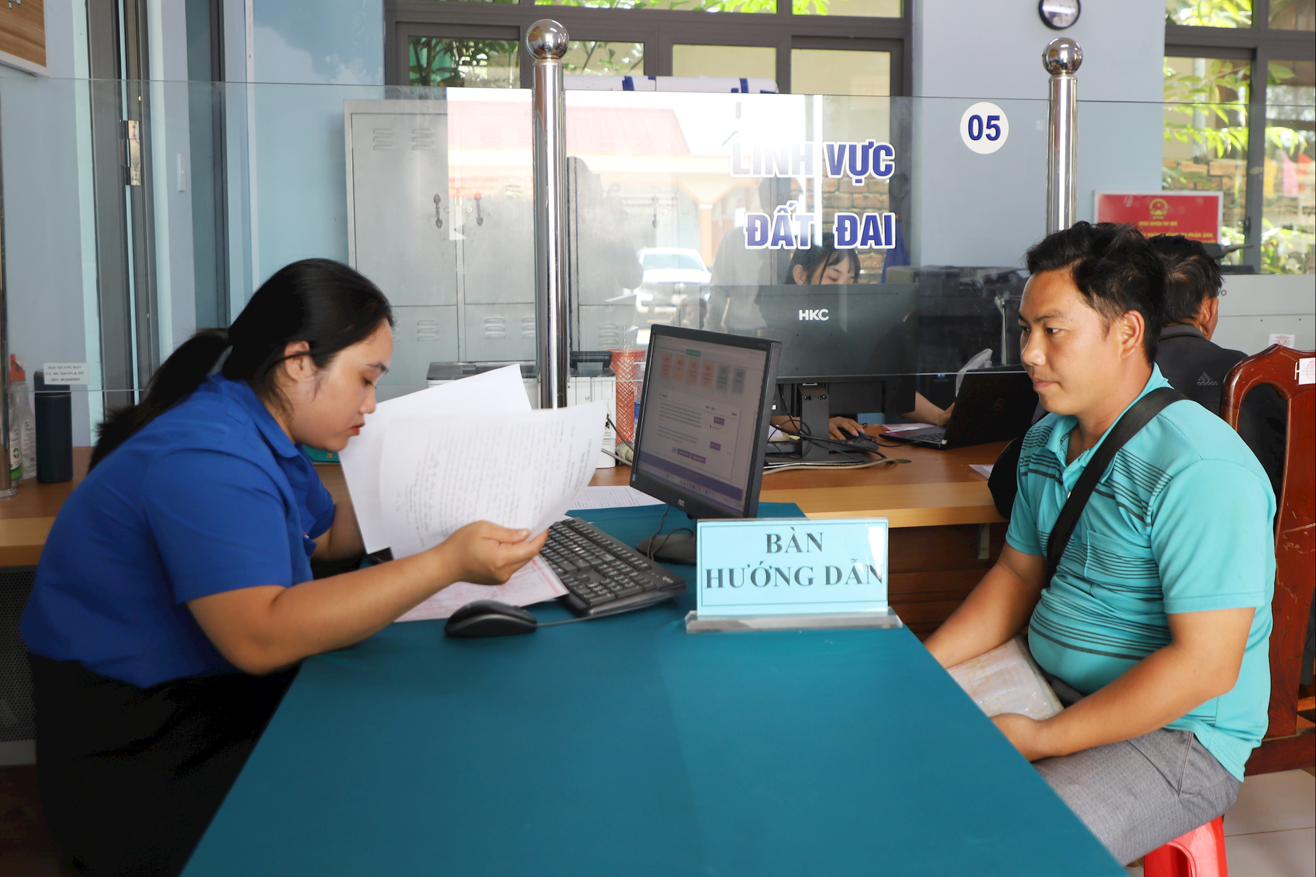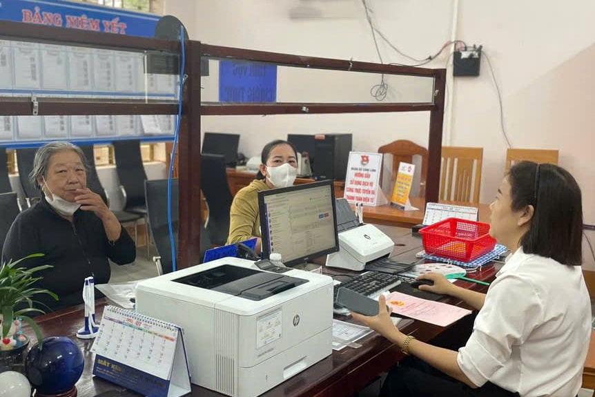 Hướng dẫn người dân giải quyết thủ tục hành chính tại Trung tâm Phục vụ hành chính công xã Sông Lũy. Ảnh K.H