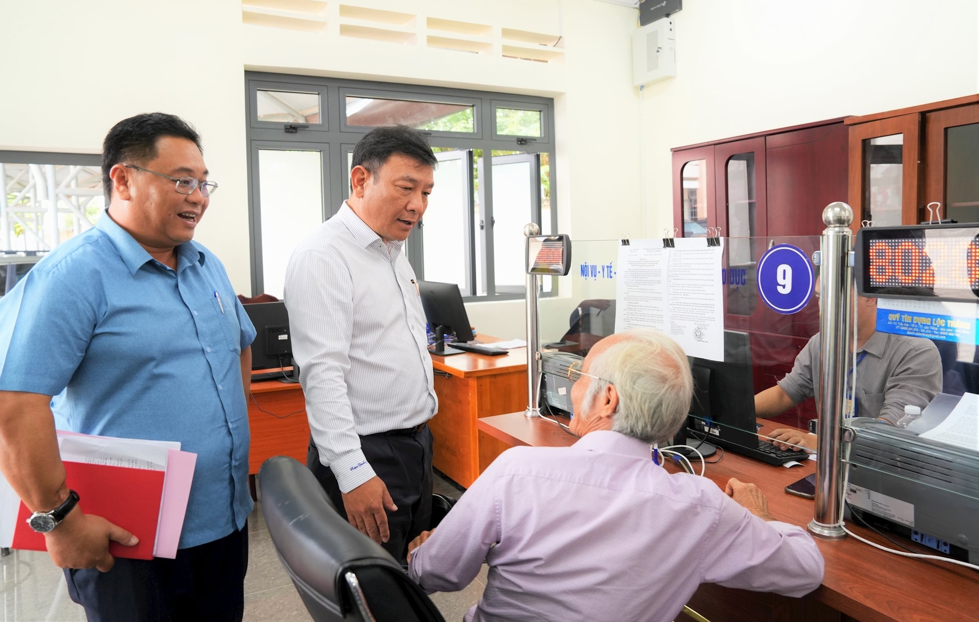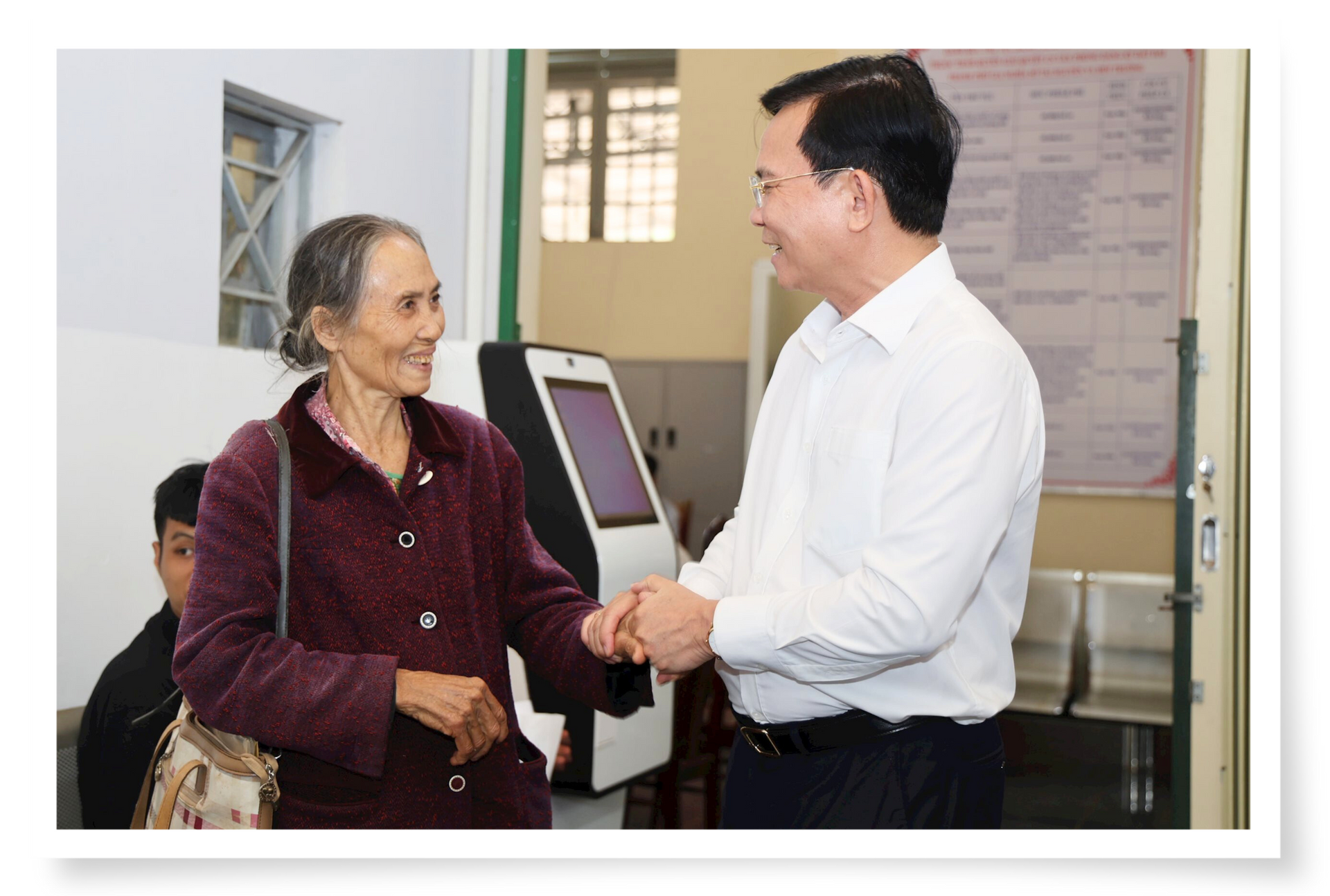 Phó Bí thư Tỉnh ủy Lâm Đồng Bùi Thắng ân cần thăm hỏi người dân khi đến giải quyết thủ tục hành chính tại Trung tâm Phục vụ Hành chính công xã Bảo Lâm 2. Ảnh: K.P