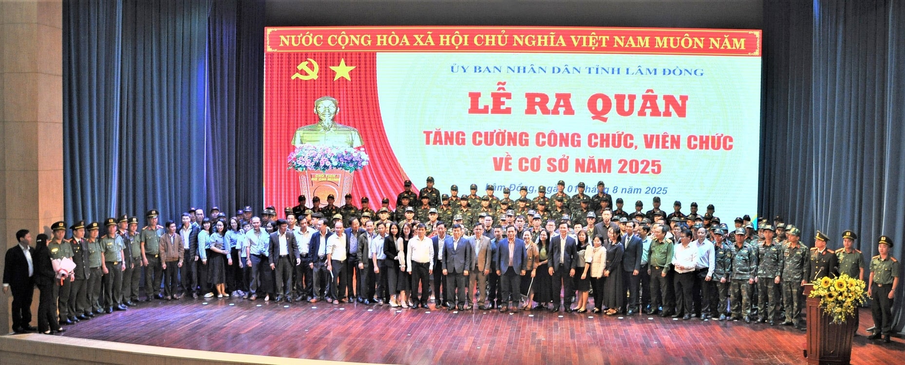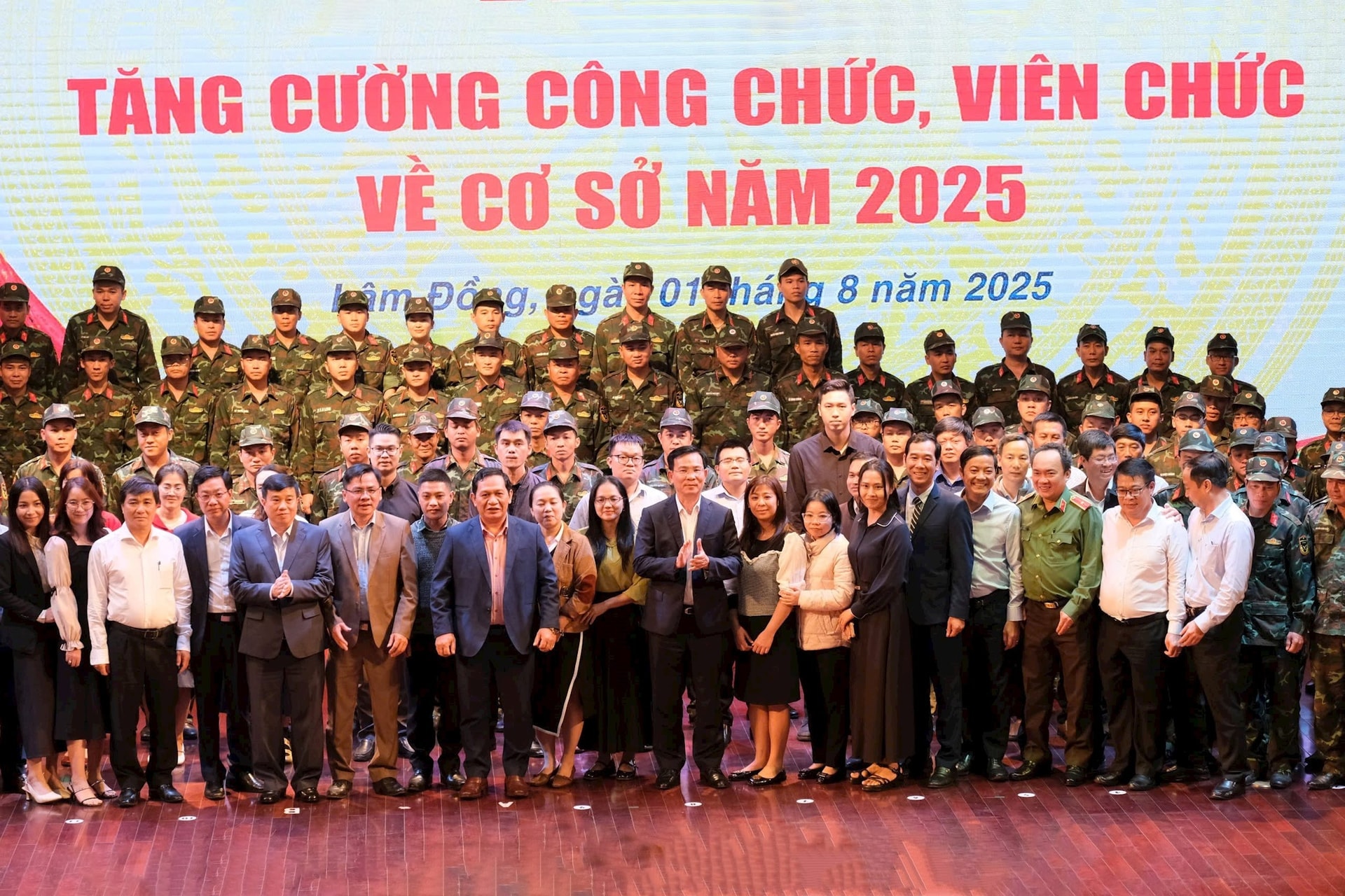 Các đại biểu Trung ương cùng lãnh đạo tỉnh Lâm Đồng chụp hình chung với CBCCVC, chiến sĩ công an và chiến sĩ quân đội tăng cường tăng cường 400 cán bộ, công chức, viên chức cấp tỉnh về cấp xã