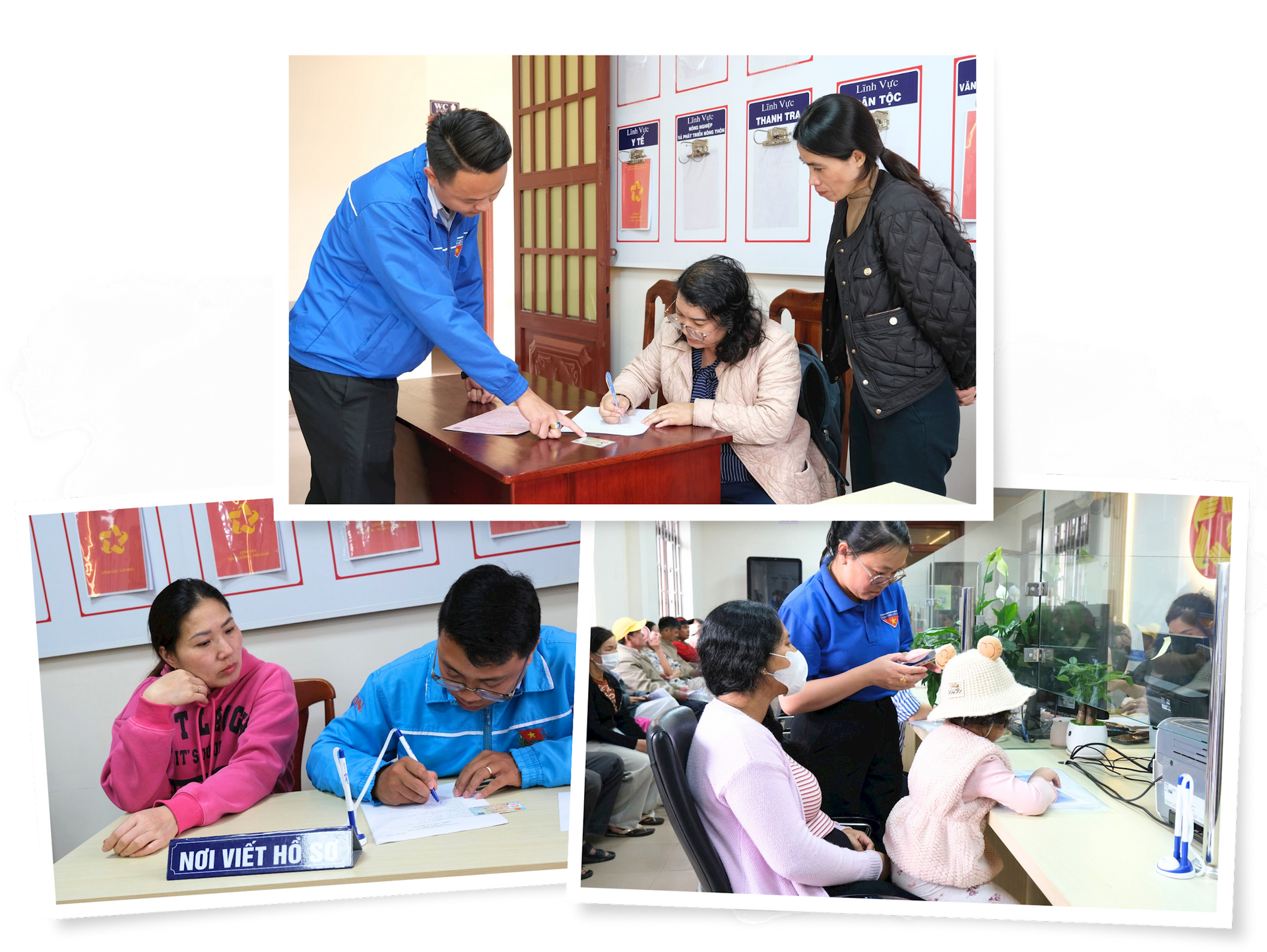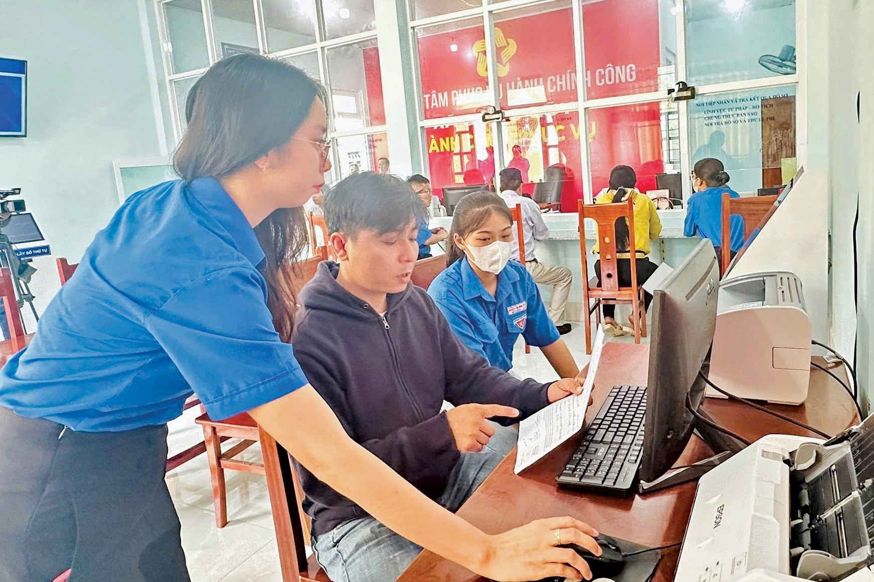 Tình nguyện viên hỗ trợ người dân viết hồ sơ, giúp thủ tục nhanh chóng và thuận tiện hơn. Ảnh: N.L
