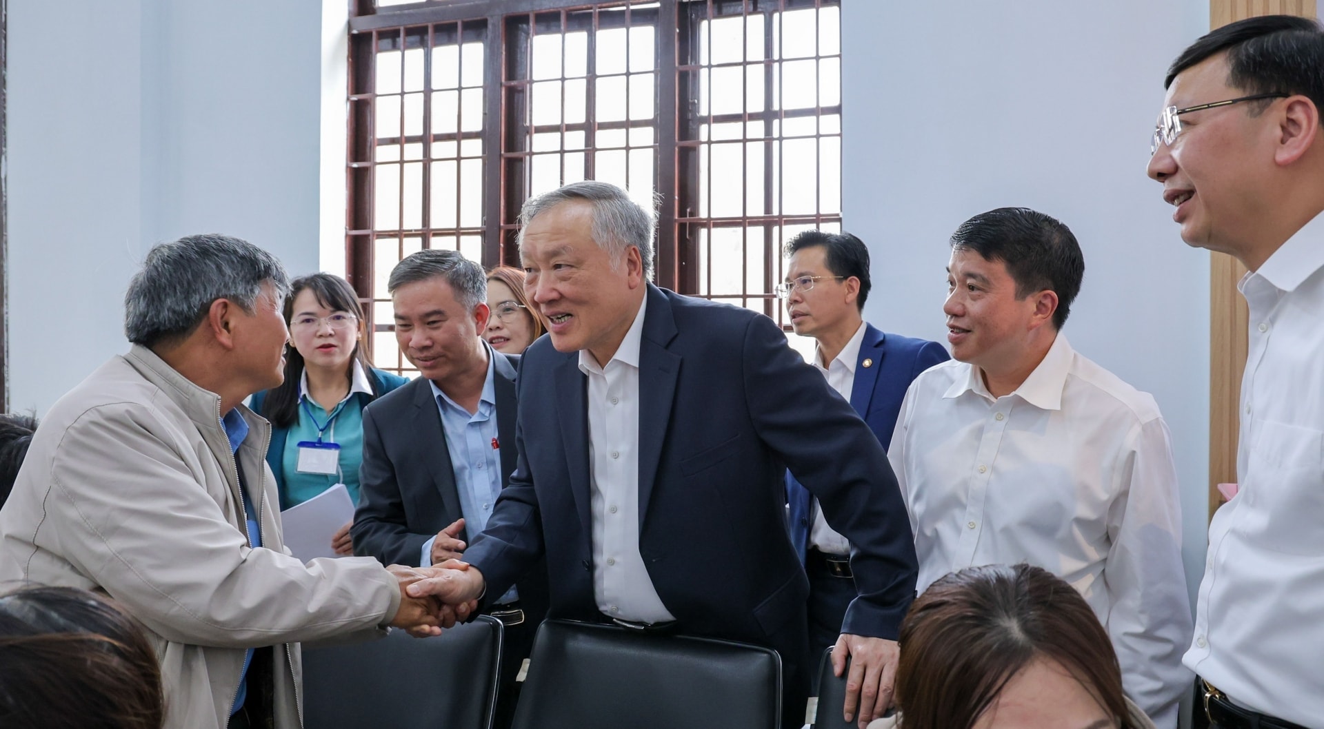Ủy viên Bộ Chính trị, Phó Thủ tướng Thường trực Chính phủ Nguyễn Hòa Bình trao đổi, hỏi han người dân đến làm thủ tục giấy tờ đất đai tại của đơn vị hành chính mới tại xã Đức Trọng, tỉnh Lâm Đồng