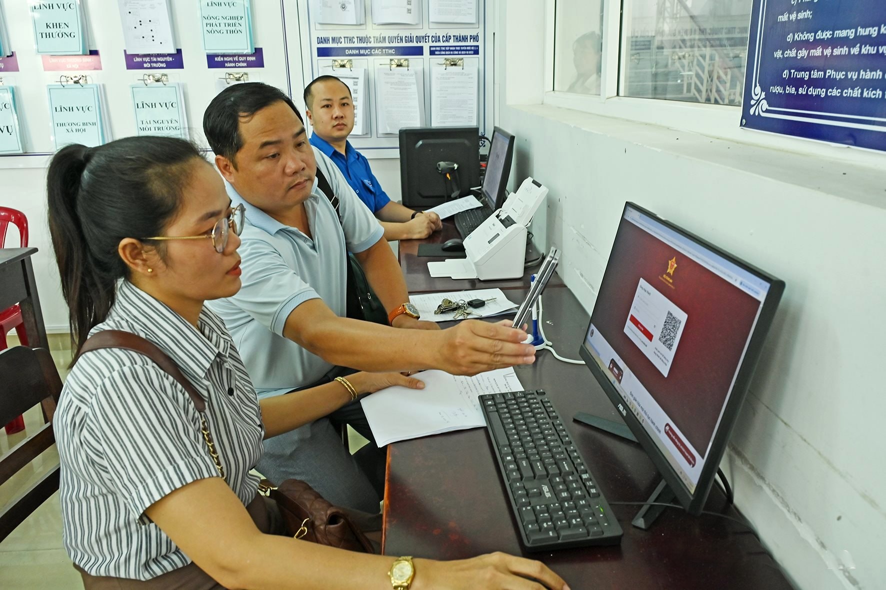 Hướng dẫn công dân đăng nhập cổng thông tin hành chính công Quốc gia tại phường Phú Thủy. Ảnh: Đ.H