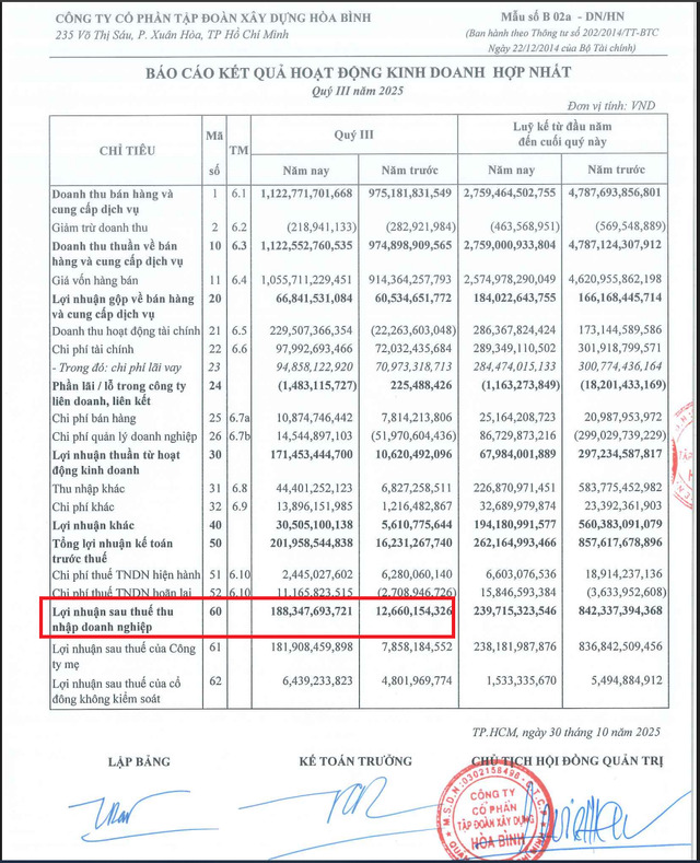 Tại thời điểm 30/9/2025, Xây dựng Hòa Bình còn lỗ lũy kế2.082 tỷ đồng.