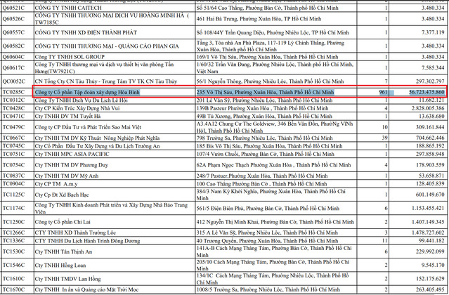 Xây dựng Hòa Bình vẫn góp mặt trong danh sách nợ bảo hiểm xã hội với số tiền lên đến hơn 56,7 tỷ đồng.