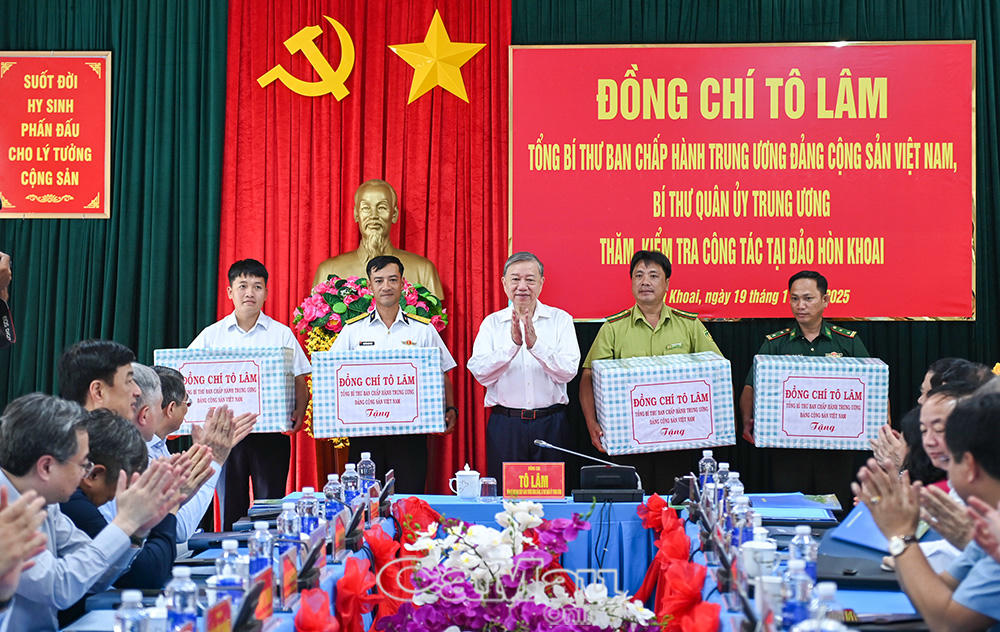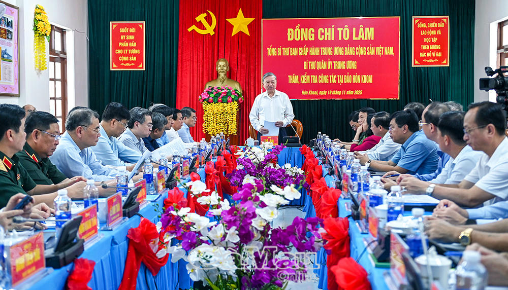 Sáng 19/11, Tổng Bí thư Tô Lâm và Đoàn Công tác Trung ương đã đến thăm và làm việc với các đơn vị Quân đội và Đảng bộ, chính quyền tỉnh Cà Mau tại đảo Hòn Khoai (thuộc xã Đất Mũi, tỉnh Cà Mau).