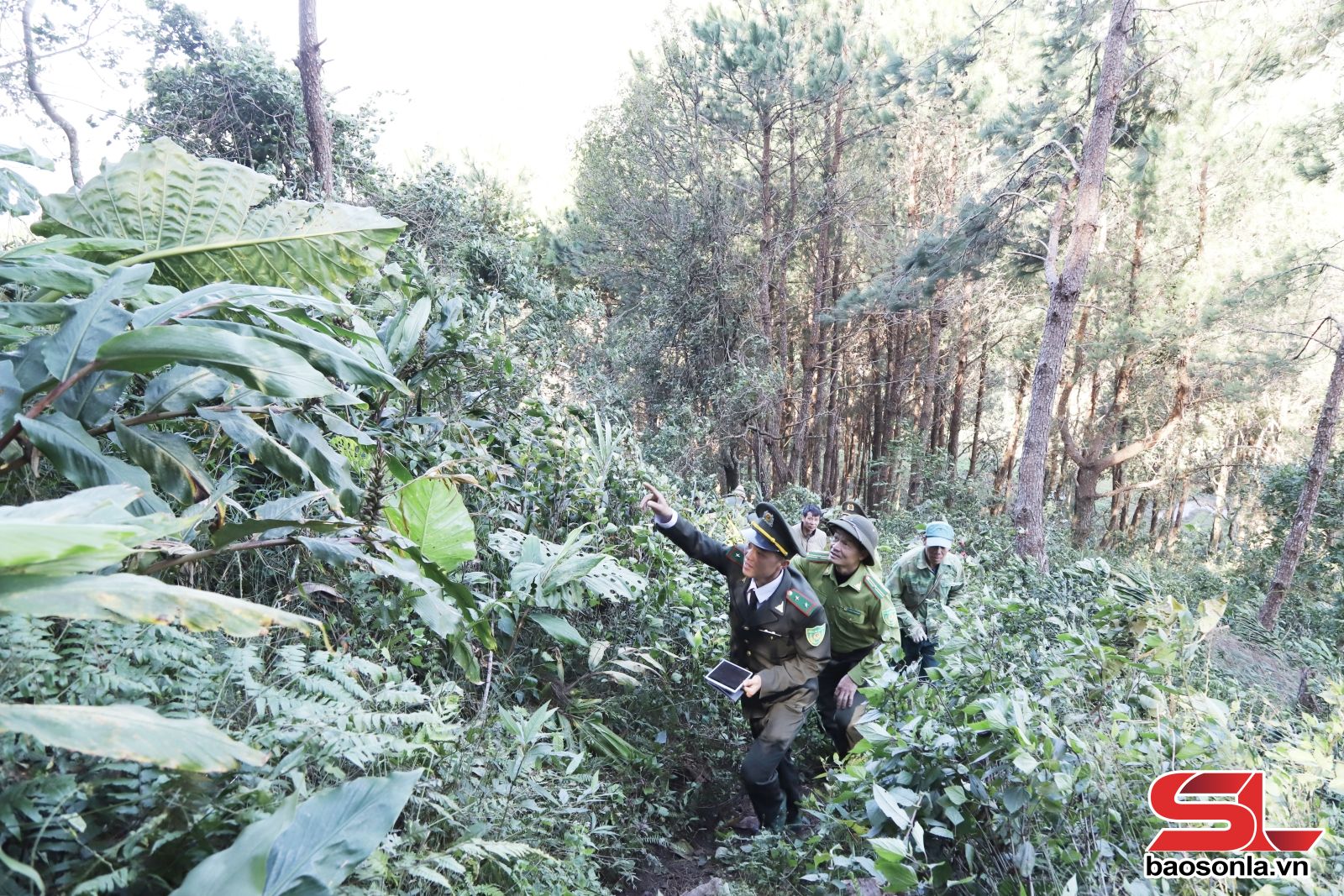 Cán bộ Ban quản lý Khu bảo tồn thiên nhiên Mường La tuần tra rừng.