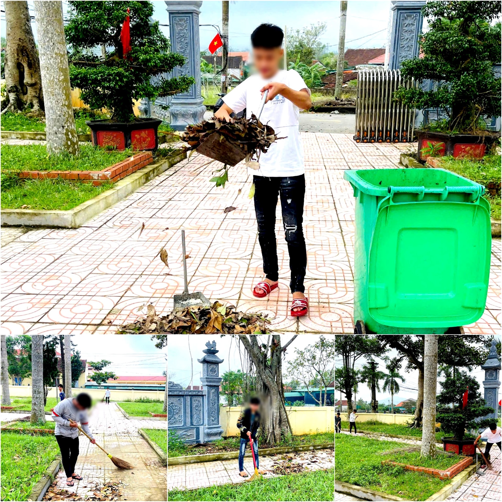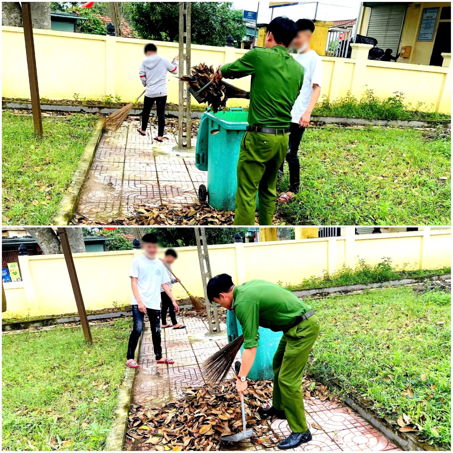 Công an xã Trường Lưu cử cán bộ cùng các em lao động chỉnh trang tại các khu vực mang nhiều ý nghĩa.